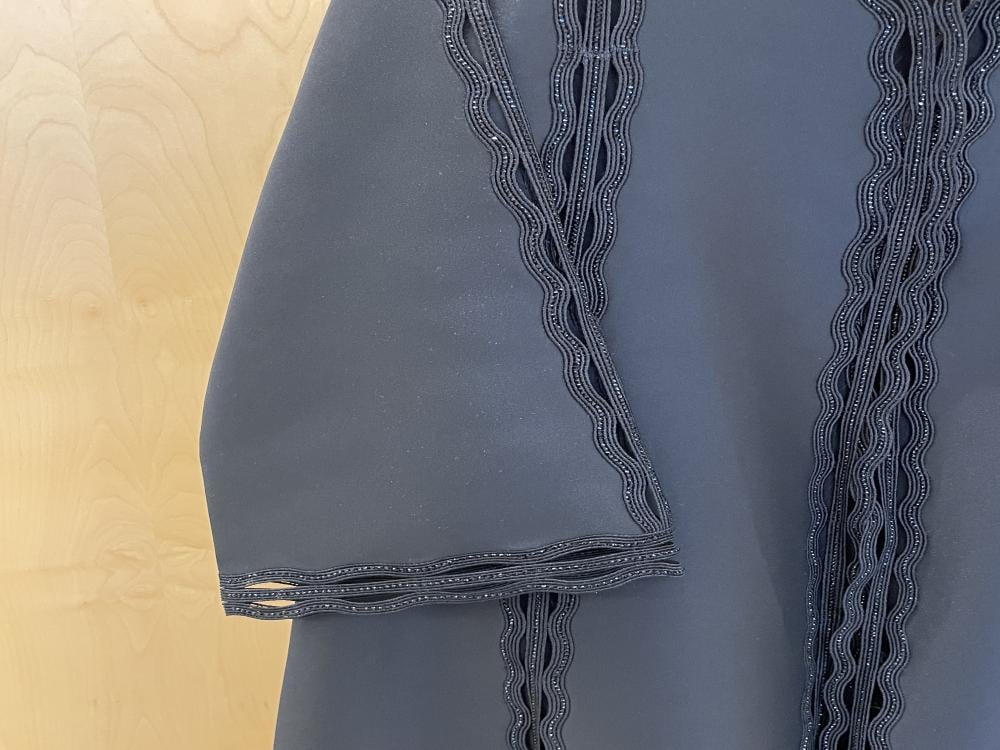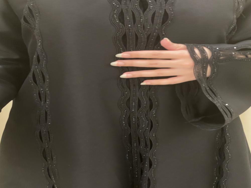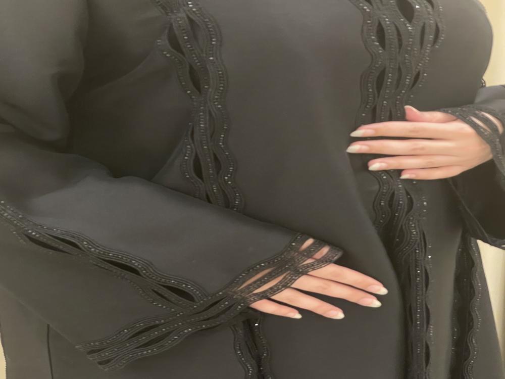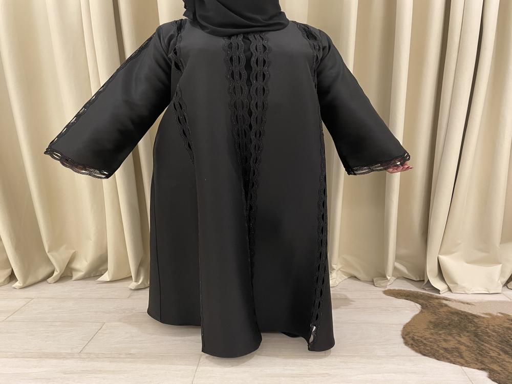 مزينة بـ كلفة سوداء ناعمة تمتد على كامل العباية، من الأمام وحتى الأكمام، لتعطيها لمسة فخامة راقية بدون تكلف.